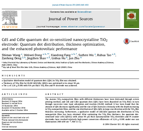 近期,安徽光机所激光技术中心功能薄膜材料研究室王时茂等研究人员在量子点敏化太阳电池(QDSCs)光阳极中量子点的分布和CuxS(硫化铜)对电极研究方面取得新进展。