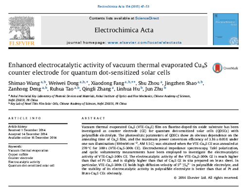 在QDSCs对电极的研究领域,引入了真空热蒸发镀膜(VTE)技术,在FTO(掺氟的氧化锡)导电玻璃基底上制备了CuxS(x=1-2)对电极,研究了VTE-CuxS对电极的催化活性、稳定性、及电池的光伏性能。结果显示,VTE-CuxS对电极催化活性(图2)和稳定性(图3)均优于常用的黄铜片基底Cu2S对电极和Pt对电极。该研究工作实现了FTO玻璃基底上CuxS对电极的制备,解决了基底易被腐蚀的问题,并且VTE技术可实现对电极的大面积制备,可以满足未来QDSCs商业化生产的需要。研究论文发表在Electrochimica Acta (2015, 154, 47-53,SCI二区)上。