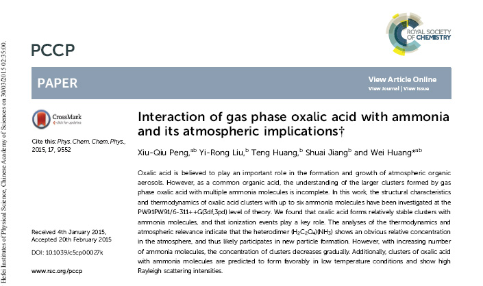 近期,安光所基础科学研究中心、中科大环光学院黄伟研究员课题组对乙二酸与氨的相互作用形成的团簇(H2C2O4)(NH3)n(n=1–6)及其对大气的影响进行了深入的理论研究,并取得进展。