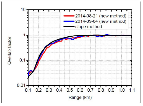 几何因子是激光雷达系统的一个重要参数,它影响过渡区内大气探测结果的准确性,因此需要准确地测定激光雷达几何因子曲线。通常采用实验的方法求解几何因子。如,Y. Sasano给出了一种常用的适合于大气水平分布均匀条件下的斜率方法,然而,对于结构复杂或者可移动箱式雷达只能垂直放置,此时激光路径上实际大气很难满足均匀的条件。为此,Ulla Wandinger发展了在大气不均匀情况下仍然可以使用的拉曼-米方法,但要求具备拉曼探测通道,对于只有米散射通道的激光雷达,则无法应用。