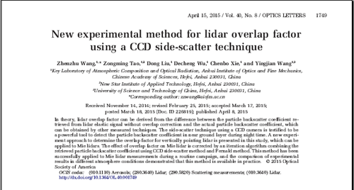 近期,安徽光机所大气光学研究中心激光雷达技术研究室王珍珠等研究人员提出新的几何因子探测方法,该方法适合于垂直放置的米散射激光雷达,这一成果发表在美国光学学会出版的OPTICS LETTERS(2015,40(8),1749-1752,SCI二区)上。