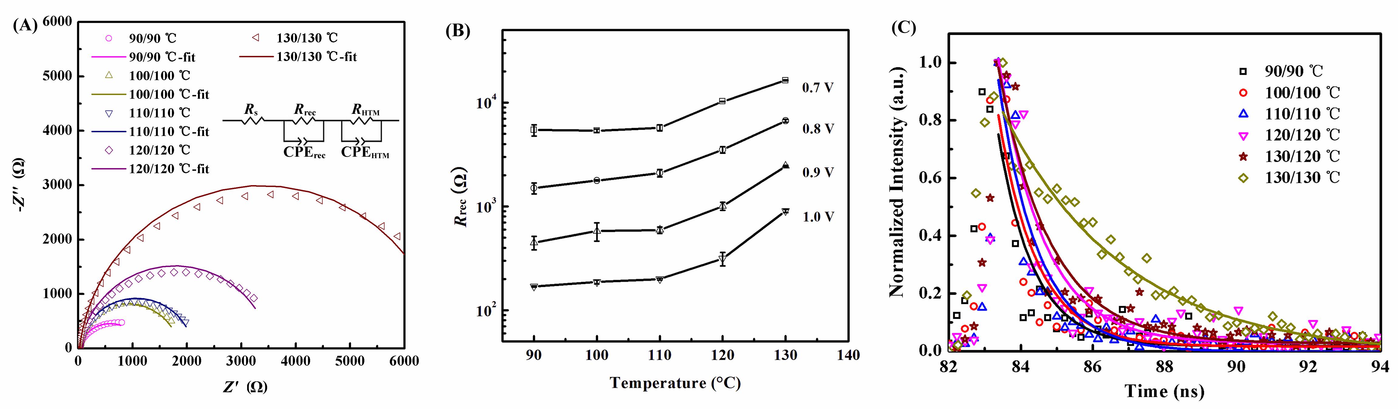 图1. (A)0.8V偏压下不同PbI2含量PSCs的电化学阻抗谱;