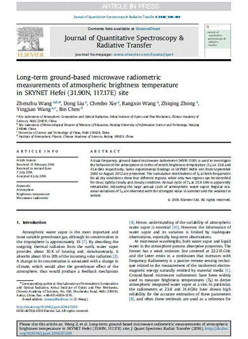 近期,安光所大气光学中心科研人员王珍珠等人利用国际SKYNET合肥超级站双频微波辐射计长期测量结果,对合肥地区大气亮温进行了深入研究,并取得新进展,其结果发表于J Quant Spectrosc Radiat Transfer。