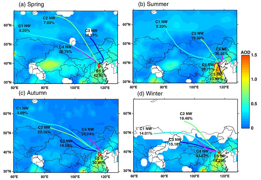 北京站点不同季节72小时后向轨迹聚类结果, 底图为Aqua 3级卫星数据