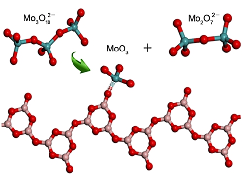 (1)研究了LiB3O5晶体固液相变过程中的结构转变,首次发现LiB3O5晶体融化过程中不仅存在热力学平衡产物Li3B7O12,也存在动力学中间产物Li2B4O7。在相变温度附近硼氧基团首先从三维的B3O3?4(?为桥氧原子)网络结构分解为B4O5?4和B2O3,再最终转化成一维的B3O4?2链状结构(见图1)。成功解释了LiB3O5熔体所特有的结构记忆效应(CrystEngComm 2015, 17, 9357?9362;J. Cryst. Growth 2016,435, 1?5)。(2)研究了Li2O?B2O3赝二元体系熔体的组成与结构之间的关系,创建了完整的硼酸锂熔体结构谱系,阐明了LiB3O5晶体生长熔体(以B2O3为助熔剂)具有高粘度以及粘度反常现象的结构原因,深化了对LiB3O5晶体生长微观过程的认识(Inorg. Chem. 2016, 55,7098?7102;CrystEngComm 2017, 19, 5721?5726,封面文章,见图2)。(3)详细研究了Li2Mo2O7、Li2Mo3O10熔体的Raman光谱特征,根据Li2Mo3O10熔体(另一种助熔剂)溶解LiB3O5晶体过程中的光谱变化,首次发现在高温下Mo3O102?基团与LiB3O5晶体作用发生取代反应,生成了MoO3·B3O4?2?配合物中间体和Mo2O72?基团(见图3)。MoO3·B3O4?2?配合物中间体是理解LiB3O5晶体生长微观过程的关键(Inorg. Chem. 2017,56, 3623?3630)。
