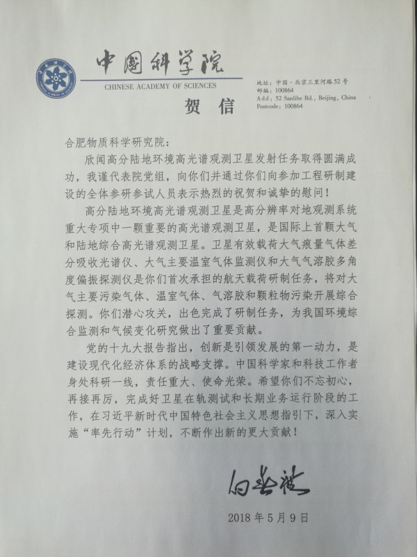 5月9日凌晨2时28分,我国首颗高分辨率大气环境观测卫星——高分五号成功发射。卫星上搭载中科院安徽光机所的三台载荷将长期在轨运行,为我国环境污染防治等工作提供重要科技支撑和空间信息服务,提升我国大气遥感监测定量化和精细化水平。这标志着我国高光谱分辨遥感卫星技术达到国际先进水平。
