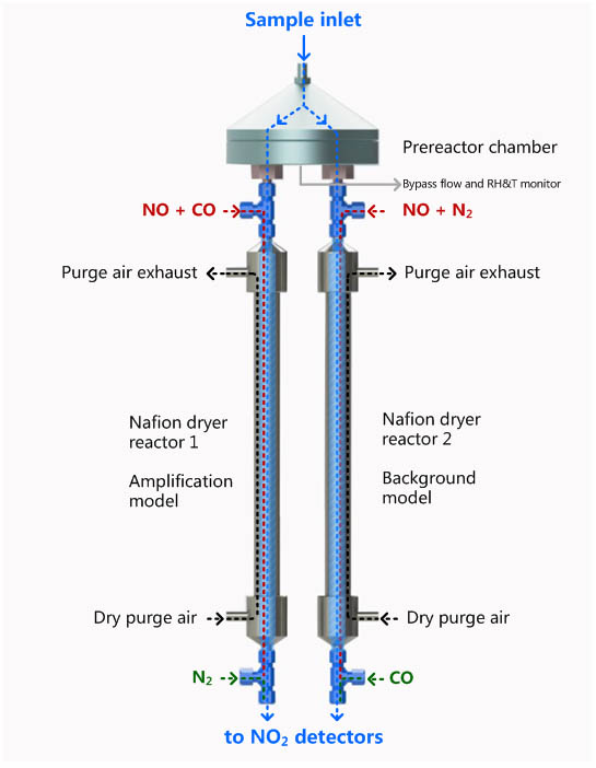 环境湿度的严重影响是PERCA技术外场应用的瓶颈问题。2018年,团队赵卫雄研究员、阳成强等人发展了一种基于Nafion干燥管进样的双通道RO2*测量新技术(Analytical Chemistry 2018, 90, 3307-3312),大气样品经Nafion干燥管干燥后进入特氟龙反应放大腔,实现RO2*的高灵敏度探测,验证了该解决思路的可行性。