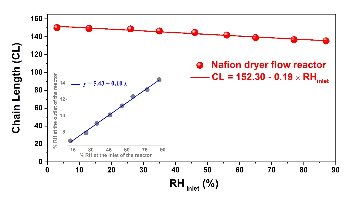 图1 上图:基于Nafion管反应腔的过氧自由基进样装置,下图:相对湿度对化学链长的影响