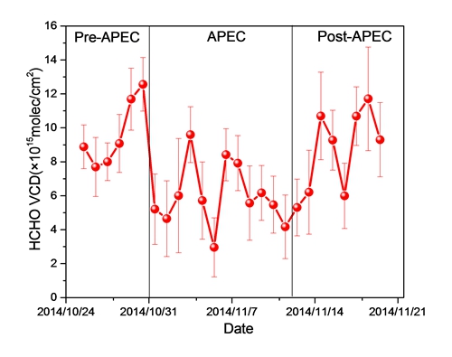 HCHO在大气光氧化反应中扮演着重要作用,作为活性气体,HCHO光解产生HO2自由基;HO2快速与NO发生反应生成OH自由基,从而影响大气的氧化能力。对流层甲醛的来源主要来包括一次直接排放和二次生成,除了人为排放,还有很小一部分HCHO来自植被的直接排放。因此,研究HCHO对于研究OH自由基以及二次有机气溶胶的形成具有重要意义。2014年APEC会议在北京怀柔区举行。为了改善APEC期间空气质量,京津冀及周边地区实施了“APEC会议空气质量保障政策”,北京以周边地区实施了不同程度的减排措施。APEC峰会为研究环境质量与污染物排放之间的关系提供了机会。