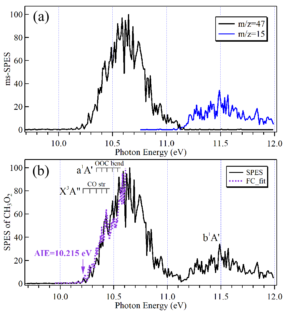 课题组唐小锋副研究员与法国SOLEIL国家实验室合作,以同步辐射光作为电离源,采用先进的真空紫外光电离符合质谱技术,对大气中含量最高的甲基过氧自由基(CH3O2)光电离动力学进行了深入研究。实验中,以微波放电流动管作为反应器,通过甲基自由基(CH3)与氧气反应产生甲基过氧自由基,在线测量获得了甲基过氧自由基的高分辨阈值光电子谱。同时,通过开展高精度的量子化学理论计算,对阈值光电子谱的电子态和振动能级等进行了标定,获得了甲基过氧自由基的绝热电离能和振动频率等基本数据和结构信息,并对甲基过氧自由基离子各个电子态的电离和解离动力学进行了研究。