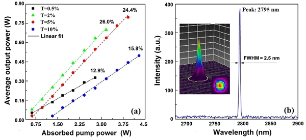 采用973纳米 LD端面泵浦的Er:LuSGG激光晶体,基于较大的晶格场强和较低的声子散射速率,目前实现了最大输出能量为789 毫瓦、斜效率为24.4%和光光转化效率为20.2%的2795 纳米连续基横模激光输出,对应的光束质量为Mx2/ My2= 1.30/1.33。通过优化谐振腔结构(输出镜透过率、腔长和腔镜曲率等)和使用更接近966 纳米波长的泵浦源等方法有望进一步提升激光的最大输出能量和斜效率。