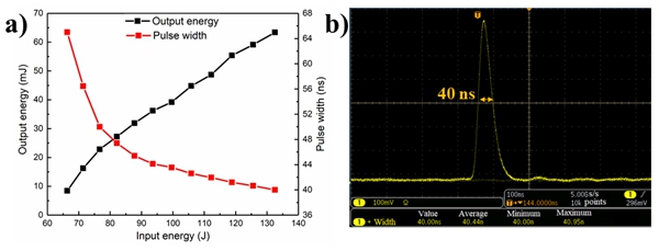 图4 氙灯泵浦Er,Pr:YAP晶体电光调Q固体激光器 (a)输出能量和脉冲宽度随泵浦能量的变化曲线;(b)最大单脉冲输出能量条件下的调Q脉冲波形图