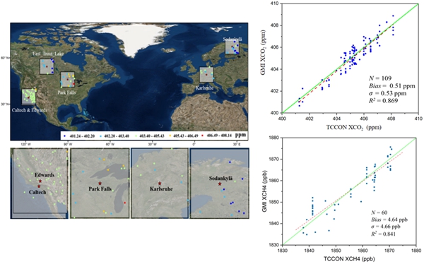 “GF-5温室气体探测仪数据精处理技术研究”项目中,安光所针对温室气体探测仪空间外差干涉数据设计了超光谱高质量数据处理方法、开发了气溶胶高值区的CO2/CH4综合反演算法,获得了温室气体探测仪全球大气CO2/CH4卫星观测结果,并服务于项目开发的CO2时空同化模型,实现中国区域同化系统的示范运行。