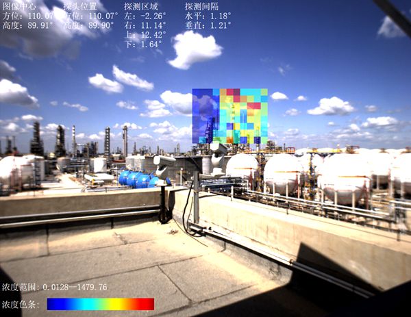 视频显示了红外气云成像设备在华北石化连续运行的部分结果,对监测区域内的多种气体成分实现了扫描成像探测。视频中显示的是9月5日凌晨开始到当天中午其中一种气体空间分布的连续变化情况。视频的每一帧中的伪彩色色块代表的是气体空间分布,颜色的深浅代表了气体含量的高低,每个色块对应的红外光谱分辨率1cm-1,波段覆盖整个中波和长波红外大气窗口。