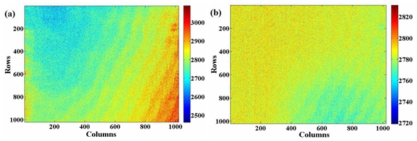 多角度偏振成像仪探测器非均匀性体现在高频和低频两个方面,高频差异体现在相邻像素点间的快速变化,低频差异体现在不同视场区域的整体缓慢变化。研究团队利用探测器综合测试系统,分析了影响非均匀校正的暗电流、帧转移效应、温度漂移等引起的光谱响应变化,并提出了多参量的非均匀性校正方法,实现探测器响应非均匀性多参量校正,校正后的探测器响应亦呈现出良好线性。