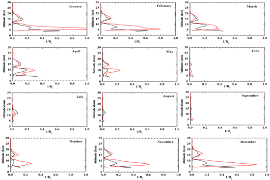 高美古站(黑线)和拉萨站(红线)1999-2018年月中值1/Ri廓线