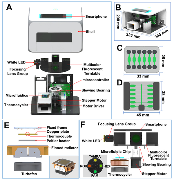 安光所团队运用MS2技术,集成了团队研发的高精度温度控制、多色微弱荧光检测、核酸快速扩增、试剂冻干等多项关键技术,构建出便携式病原体核酸即时检测系统。智能手机客户端能控制温度控制、图像采集、数据处理和结果分析等核酸检测全流程,还可根据需求选择不同的微流控芯片完成定量聚合酶链式反应(qPCR)、多重聚合酶链式反应(multiplex PCR)或等温扩增检测,检测结果与传统实验室分析设备达到同等水平。