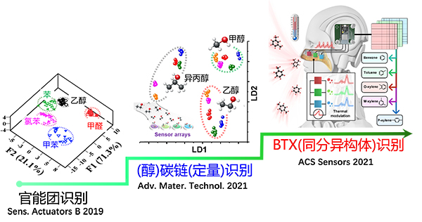 相关成果分别以“基于非选择性金属氧化物的智能传感系统识别苯系物分子”和“氧化镍传感器阵列热调制定量识别醇类分子”为题,发表于ACS Sensors和Advanced Materials Technologies杂志上。