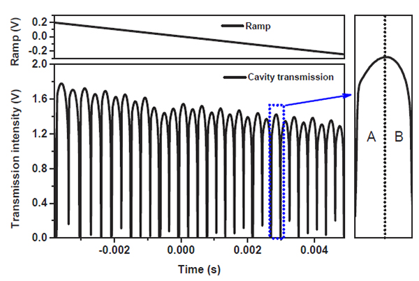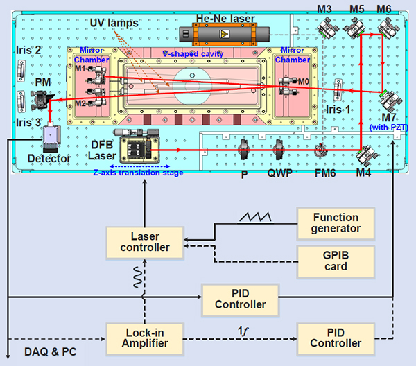 团队赵卫雄研究员和杨娜娜博士等人发展了2.8微米中红外光学反馈腔增强技术,为OH自由基探测提供了一种新的直接探测手段。该技术利用谐振腔的共振光反馈回激光器,可以有效压窄激光器线宽,实现光学自锁定,提高激光入射谐振腔的耦合效率,实现高灵敏度探测。团队采用波长调制的方法,以腔模的一次谐波为误差信号反馈给压电陶瓷控制器,精确控制距离,从而达到相位实时锁定。在800 米有效光程下获得1.7×10-9 厘米-1探测灵敏度,对应OH自由基探测极限为~2×108 个/立方厘米。该技术进一步与磁旋转吸收光谱(FRS)和频率调制光谱(FMS)等技术相结合,将为大气OH自由基直接探测提供新的途径。