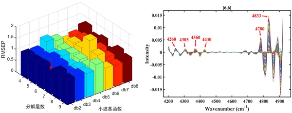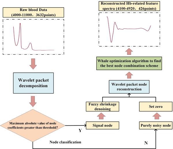 NIRS具有便捷、无创、灵敏等优势,但在全血检测中,强烈的水吸收、样品散射与仪器噪声等会显著淹没血红蛋白(Hb)微弱吸收特征,制约定量精度。针对这一难题,研究团队提出一项一体化处理与检索新方法:将小波包-模糊收缩去噪(WPT-FS)与鲸鱼优化算法(WOA)相结合,先以自适应的“模糊收缩”阈值函数在多尺度上抑制噪声、保留潜在有效系数,再利用群智能优化在高维节点空间中搜索最优特征节点组合,重构富含Hb信息的特征光谱,并基于偏最小二乘(PLS)完成定量建模。
