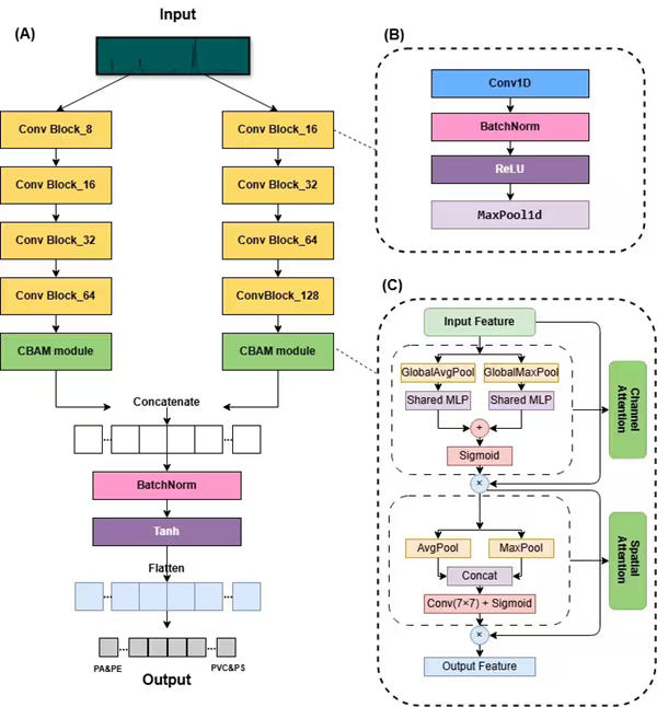 现实中的微塑料往往是混合的,混合后的微塑料光谱图往往会更加复杂,会包含各单组分微塑料的光谱特征峰,微塑料的混合比例也会让光谱特征峰产生新的峰强和相对峰强变化,增加了对微塑料表征难度,而传统的机器学习算法提取到的光谱特征有限,对微塑料的表征不够准确。针对这一难题,本研究创新性地将高效注意力机制CBAM应用于双分支卷积神经网络上,两个分支将CBAM注意力模块的输出进行连接,提取更多光谱特征,从而优化模型的分类性能,并取得高达98%的分类准确率,优于RF、PLS-DA、SVM、KNN、CNN等传统算法模型。CBAM模块首先通过通道注意力模块筛选出关键通道,再借助空间注意力模块定位各通道中的重要空间区域,最终生成注意力图并与输入特征图逐元素相乘,完成特征精炼。结合GradCAM可视化卷积神经网络,更加清晰的显示了模型表征微塑料过程中所选取的重要特征。