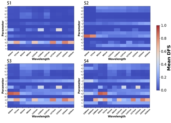 在观测场景 S1–S4 下,各参数的平均 DFS 与波长 (650nm–2460nm) 的关系