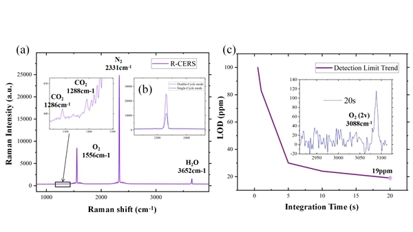 基于该新型装置,研究团队对空气中的痕量气体进行了测试。结果显示,在常温常压下,系统对二氧化碳(CO₂2)的检测限(LOD)达到了 19 ppm(20秒积分时间),并成功识别出空气中微量的水汽和氧气同位素信号。