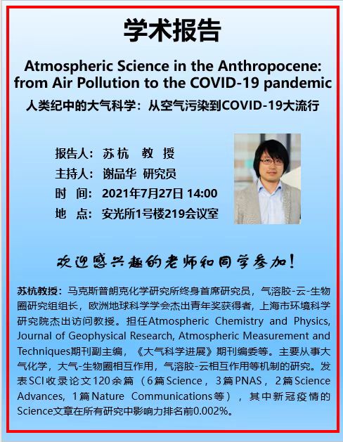 学术报告:人类纪中的大气科学-从空气污染到COVID-19大流行(7.27)