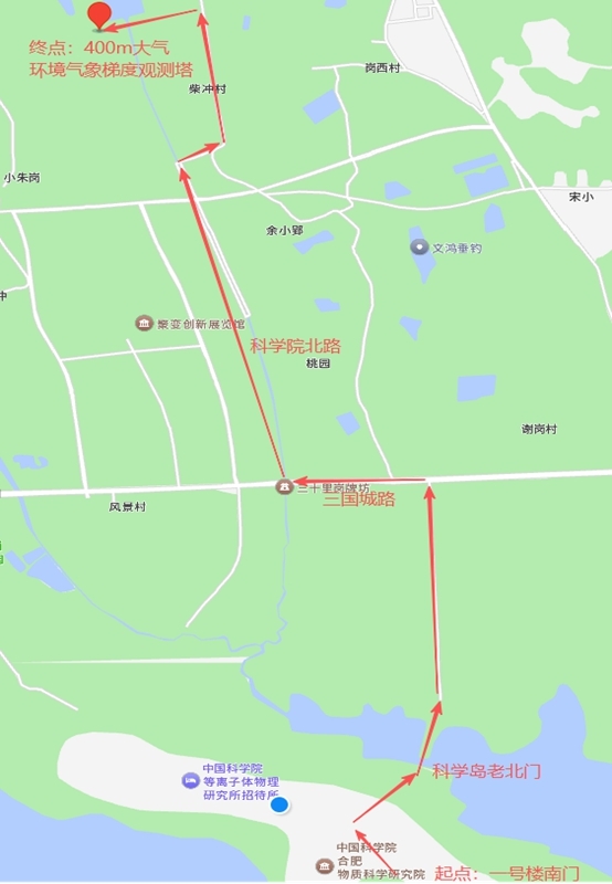 一号楼南门为起点,往西从北门出岛,在三国城路左转,到科学院北路右转,终点为400米大气环境气象梯度观测塔(庐州塔),全程约5公里。