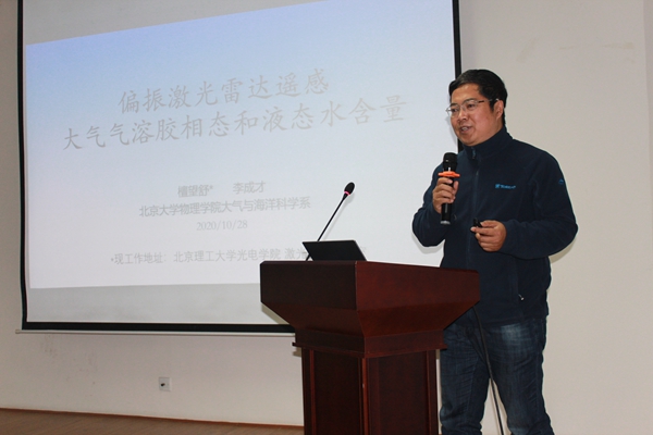 李成才副教授主要从事大气辐射与大气遥感方向的研究,在研究气溶胶粒子相态垂直廓线的方法中取得了创新性成就。在他的报告中,详细介绍了偏振激光雷达在检测粒子相态方面的重大应用,通过利用不同相态的粒子退偏振能力的差异,建立了利用气溶胶粒子后向散射退偏振比反演气溶胶相态的参数化方案,并首次实现了长时间连续的气溶胶相态垂直廓线的探测。