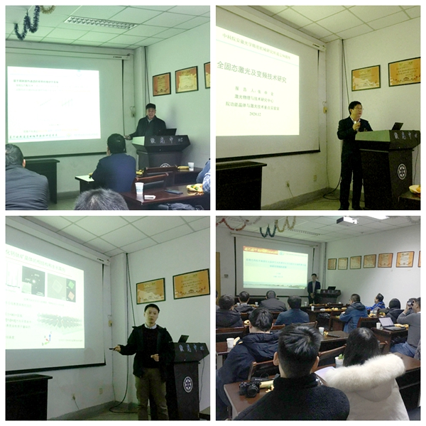 来自华南师范大学的陈长水教授、中科院理化技术研究所的张申金研究员、江苏第二师范学院的王迪副教授和安徽工业大学的丁守军副教授分别做了题为“基于绝热的光转化研究”、“全固态激光及变频技术研究”、“空间束缚液相外延生长钙钛矿二维单晶及其光电性能研究”、“在地方高校开展提拉法晶体生长的艰辛及当前在抗辐照激光晶体研究领域的进展”4篇报告,就理论创新,科研条件建设、基础科学问题研究、核心技术攻关、激光器工程化开发与应用等方面与大家进行了深入的交流和讨论。