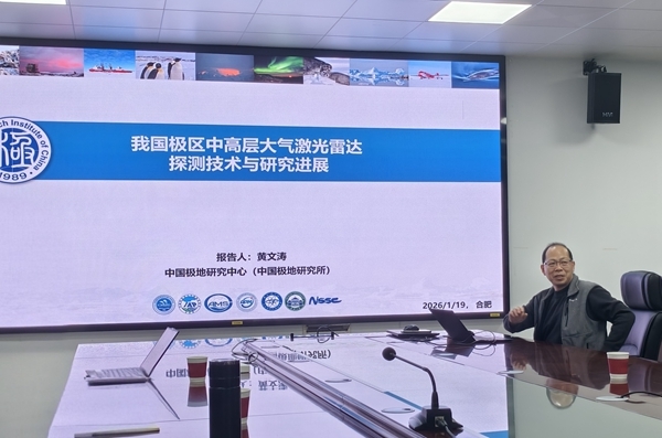 1月19日,中国极地研究中心黄文涛研究员受邀做客安光所大气光学中心,作题为《我国极区中高层大气激光雷达探测技术与研究进展》的学术报告。黄文涛研究员深耕极区激光雷达探测领域多年,自2016年起投身极地研究,曾四次赴南极麦克默多站、中山站开展激光雷达部署与观测工作,积累了丰富的极地探测科研经验与前沿研究成果。报告由大气光学中心刘东研究员主持。