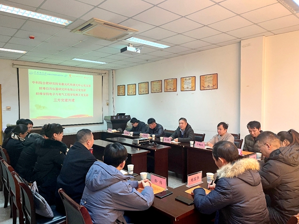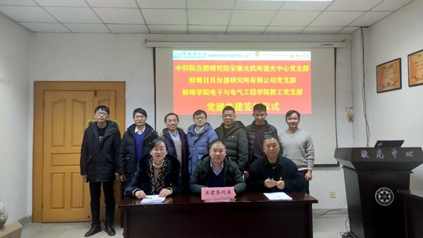 为深入学习党的十九届六中全会精神,贯彻习近平总书记新时代中国特色社会主义思想,推进基层党组织建设工作互学互鉴、融通共进,12月25日,安光所激光技术研究中心党支部与蚌埠学院电子与电气工程学院教工党支部、蚌埠日月仪器研究所有限公司党支部联合开展“党建共建谋新篇 产学研用融合促发展”主题党日和共建党课活动。蚌埠学院电子与电气工程学院教工党支部王艳春书记、办公室主任刘旭、工会主席孙长伟、骨干教师李瑜庆、董坤等,日月集团陈荡董事长、传感器事业部经理孙伟、称重事业部经理刘国华、油田事业部经理章转华、行政总监秦倩倩,以及安光所激光中心党支部书记张志荣、研究室副主任汤玉泉等多位党员同志参加了此次活动。联合活动由中心支部书记张志荣主持。