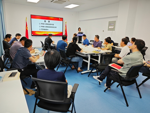 随后,支部委员邓赞红以主题党课的形式,带领全体党员深入学习了中央八项规定精神。她详细讲解了八项规定的具体内容,回顾了从六项规定到八项规定的历史沿革,并通过分享相关警示教育案例,从理论与实际多维度加深了党员们对中央八项规定精神的理解。一个个真实案例敲响了廉洁自律的警钟,使党员们更加明确行为的边界和准则。