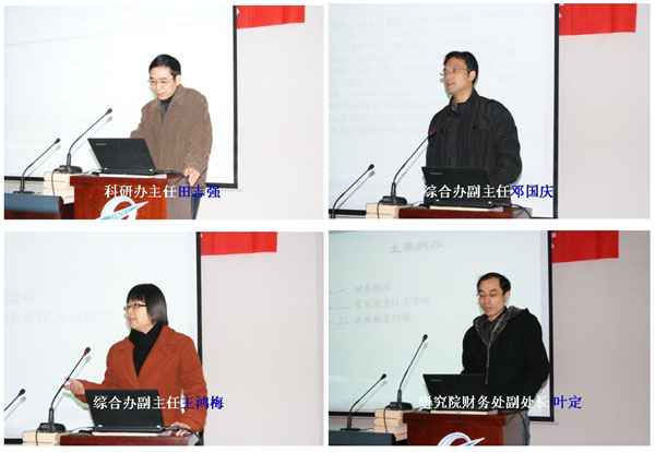 科研项目办公室主任田志强,综合办副主任邓国庆、王鸿梅,研究院财务处副处长叶定等围绕研究所两办的职能分工,科研管理工作、综合管理工作、财务管理、各类规章制度等内容进行了详细介绍,希望新职工博学广文、开拓进取,为推进我所的创新发展做出积极的努力。