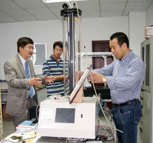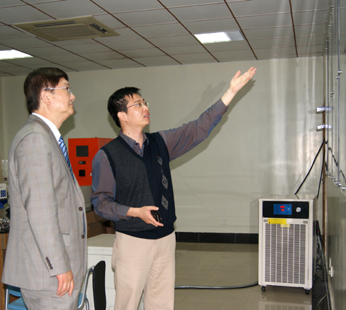 在环境光学中心光散射研究室,刘建国副所长向裴有康教授介绍了光散射研究室开展的衰荡光谱高灵敏检测方法、开放光路红外光谱多组份在线监测技术、车载通量快速遥测技术、差分吸收光谱等光学监测技术,其中大气成份差分光学吸收光谱在线监测系统、震荡天平法大气颗粒物监测仪、大气颗粒物碳黑气溶胶监测仪、能见度仪等与之研究方向密切相关的研究技术引起了裴教授的注意。