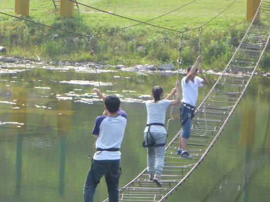 在“鱼跃龙门”项目中,绳索吊着倾斜的木桩或木板悬在水面上,需要极强的平衡能力和臂力才能通过。很多同学一改往日的书生气息,即使跌落水中仍然坚持完成挑战,激发出了自身的巨大潜能;在“激情360”项目中,挑战者们需要脚踏钢铁架构的360°翻转踏板通过索桥,每个人的平衡与否都会影响其他队员的节奏。全体师生通过不断沟通尝试,采用统一指挥、统一口号、统一步伐等方式,很快的掌握了通过索桥的有效方法,成功的完成了挑战。