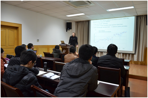 访问期间,中德双方进行了最新研究成果的交流,并详细讨论了实验方案。Thomas教授还受邀作了“MAX-DOAS测量中辐射、色彩因子和O4 DSCD的绝对校准新方法”的专题报告,为MAX-DOAS技术中云和气溶胶的校正提供了新的思路;此外,还参加了环境光学中心紫外研究室的研究生开题/中期检查等活动。