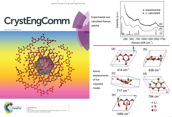 近日,安徽光机所激光中心晶体材料实验室万松明研究员及其团队提出了通过硼酸盐晶体结构及其融化过程中的结构变化来认识硼酸盐熔体结构的新思路,并将密度泛函微扰理论应用于熔体结构分析,为硼酸盐熔体结构提供了新的研究方法。有关BiB3O6和Li2B4O7熔体结构的研究工作相继在国际著名晶体学期刊《CrystEngComm》(《晶体工程通讯》)上发表。其中,BiB3O6熔体的研究结果被审稿人认为:提供了一种复杂熔体结构研究的普适方法,是熔体结构研究观点和方法上的新突破。4月21日,Li2B4O7熔体结构的研究又在《CrystEngComm》上以封面文章刊出。