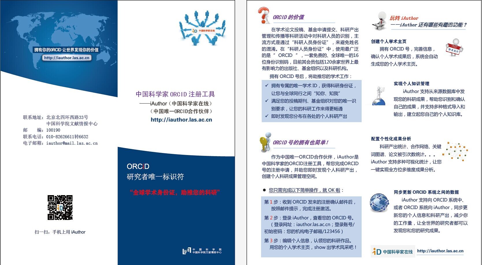 iAuthor是ORCID在中国的唯一合作伙伴,是中国科学家注册ORCID的辅助工具,通过iAuthor可以将我院IR、CSCD和Web of Science中的研究成果同步到ORCID中,同时生成您个人的学术主页,帮助您管理个人科研产出,打通您在基金申请、投稿发文、科研管理中的多个工作环节。