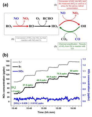 课题组赵卫雄副研究员、研究生陈杨、阳成强等人将宽带腔增强吸收光谱技术(IBBCEAS)与化学放大法(PERCA)相结合,发展了过氧自由基新的实时在线测量方法。PERCA方法通过链式反应将过氧自由基转化为浓度较高的NO2,使用IBBCEAS测量NO2实现过氧自由基的高灵敏度探测。IBBCEAS宽带光谱的测量,可以有效排除其它气体吸收或者气溶胶消光对NO2测量的影响,准确度高。在60s采样时间下,可实现过氧自由基0.9pptv的探测极限。该装置的发展和建立,将在实验室研究和外场观测中发挥重要的作用,促进大气光氧化反应机理的深入研究。