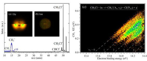 最近,双方进一步合作,利用光电子光离子符合技术制备具有量子态选择的氯甲烷离子,开展了氯甲烷离子的解离动力学研究。通过同步辐射实验,获得了具有质量选择的阈值光电子谱和高分辨的电子/离子平动能符合图像,精确测量了氯甲烷离子解离碎片的出现势,并对解离碎片的内能分布进行了标定。结果表明氯甲烷离子的解离具有明显的量子态选择效应,结合高精度的量子化学理论计算,全面清晰地揭示了氯甲烷离子各个电子态的解离动力学信息。