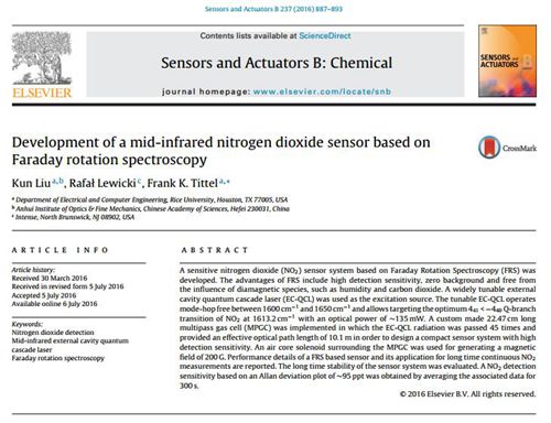 刘锟副研究员与美国Rice大学Frank Tittel教授合作,利用二氧化氮分子在纵向磁场中发生能级塞曼分裂效应,开展了法拉第磁旋转光谱高灵敏度检测痕量二氧化氮(NO2)的研究。该技术能够排除大气其它抗磁性分子(如水和二氧化碳等)的吸收干扰,具有探测灵敏度高、精度高、响应快、实时在线非破坏测量等优点,克服了当前商业二氧化氮分析仪所存在的问题。在该技术的研究过程中,刘锟副研究员引入了光学多通吸收光谱技术,大大增加了光与样品在磁场中的相互作用程长,最终实现了95 ppt的探测灵敏度,并把该技术首次用于大气二氧化氮的长时间连续观测。在该传感装置建立过程中,引入了远程控制功能,在美国休斯顿开展大气二氧化氮长时间连续观测过程中,成功实现了从中国远程控制、监控该传感装置。