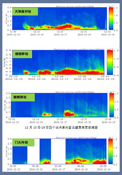自2013年起,安徽光机所环境光学中心就在京津冀地区建立了激光雷达监测网,数年来一直保持良好的工作状态。期间参加了2014年APEC峰会、2015年九三胜利日阅兵等国家大型活动的空气质量保障和减排效果评估工作,持续提供大气污染立体探测技术支持。目前在北京天津地区仍有4个站点长期运行:北京门头沟站用于监测太行山山前污染输送带;天津高村站点用于监测东南方向的输送通道;健德桥站用于监测北京市区颗粒物的时空分布特征,中央电视台新闻联播气象预报节目中就采用了健德桥站监测数据,直观形象的表示了霾层时空分布情况;北京怀柔雁栖湖站位于北京最北面,用于区域背景的监测。12月,该激光雷达监测网完整的记录下北京地区自2013年12月以来持续时间最长、程度最重的灰霾发生、发展、消散过程。