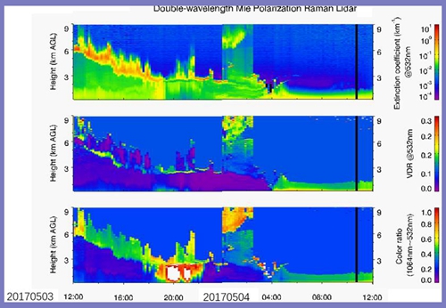 安光所拉曼米散射激光雷达产品主要用于大气气溶胶和云的垂直廓线探测。利用双波长探测可以反演气溶胶粒子的大小特征(PM2.5, PM10),偏振探测识别大气中的非球形粒子(沙尘,卷云粒子),607nm波长拉曼散射用于气溶胶消光系数的反演,减少激光雷达比的假设,提高数据反演精度,目前该技术已经参加了973项目、科技部项目、科学院先导专项、基地选址等多种大型野外观测实验。