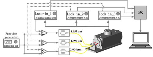 光声光谱是一种灵敏度高、选择性好、结构简单的光谱传感手段,多组分同步探测传感器可广泛应用在大气探测、环境监测、工业和电力等领域,光声光谱仪的一个声学腔只有一个最佳的工作频率f0,在采用多光源进行多组分同时探测时,无法区分、提取各光源所对应的光声信号,只能采用分时复用或一个激光频率对应一个光声池的方式,大大增加了光声光谱多组分探测系统的复杂性、体积和成本。因此,光声光谱仪器如何采用多光源实现多组分同时探测一直是一个有待解决的技术瓶颈。