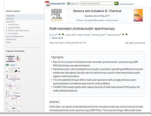 近期,安光所高晓明研究团队刘锟副研究员在多通道光声光谱技术研究方面取得了新的突破,相关研究工作以“Multi-resonator photoacoustic spectroscopy”为题在Sensors and Actuators B: Chemical期刊(一区,IF: 4.7)上在线发表。