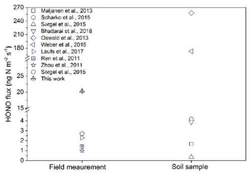 图三、 与文献中观测到的HONO通量的比较