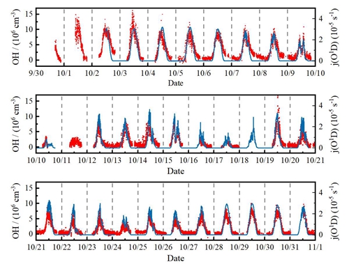 课题组胡仁志副研究员等人在前期研究的激光诱导荧光技术(LIF)基础上,解决了激光高效耦合、低损耗采样、荧光高灵敏度探测、准确定标等难题,自主研发了一套用于大气OH自由基外场测量系统,成功应用于2018年9月30日-11月11日的深圳秋季综合长期的外场观测(STORM)。这次外场观测首次验证了系统对OH自由基高灵敏、高时间分辨率、实时在线测量的性能,并有效的获得了的日变化趋势;在与臭氧光解率(由于臭氧光解是OH自由基的主要来源)的比较分析中得到了较高的相关性。日间OH自由基平均峰值浓度水平在6.6×106 cm-3,这表明深圳秋季日间光化学过程依然较强。