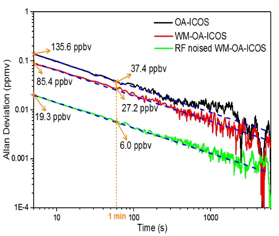 基于光学谐振腔的离轴积分腔输出光谱技术具有灵敏度高、响应时间快等优点,在大气痕量气体检测和深海可燃冰勘探等方面具有广阔的应用前景。课题组博士生王静静等人使用1.65μm的DFB激光器和99.999%的高反镜建立了一套波长调制离轴积分腔输出光谱系统。激光器采用三个不同频率注入电流同时进行调制:(1)低频三角波用于扫描激光波长;(2)高频正弦波用于波长调制和消除1/f噪声;(3)射频(RF)白噪声用于抑制由残余腔模式波动引起的噪声。与未受干扰的离轴积分腔输出光谱相比,这种RF白噪声扰动的波长调制离轴积分腔输出光谱的最小可探测极限提高了约6倍。